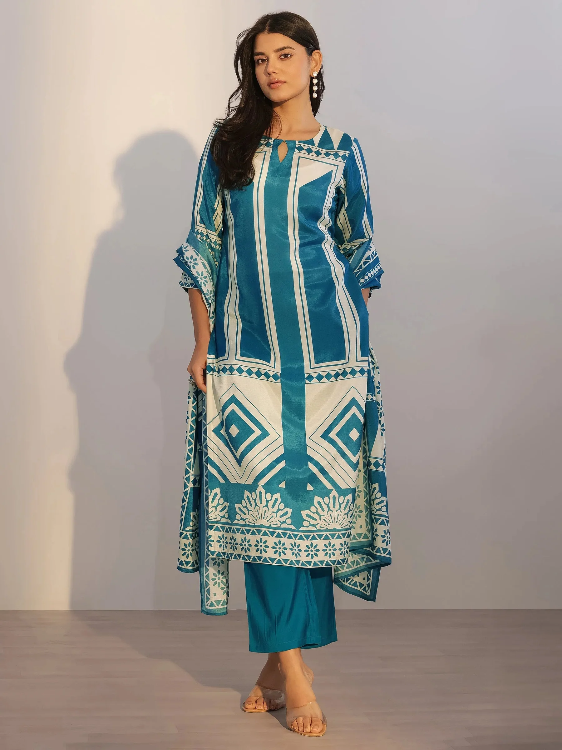 Our 3-piece teal silk blend straight suit set features a straight-fit kurta with a keyhole neckline and three-quarter sleeves. Complemented with straight pants with a partially elasticated waistband, roomy pockets, and a printed dupatta. Adorned with geometric prints, this elegant style is perfect for festive celebrations.